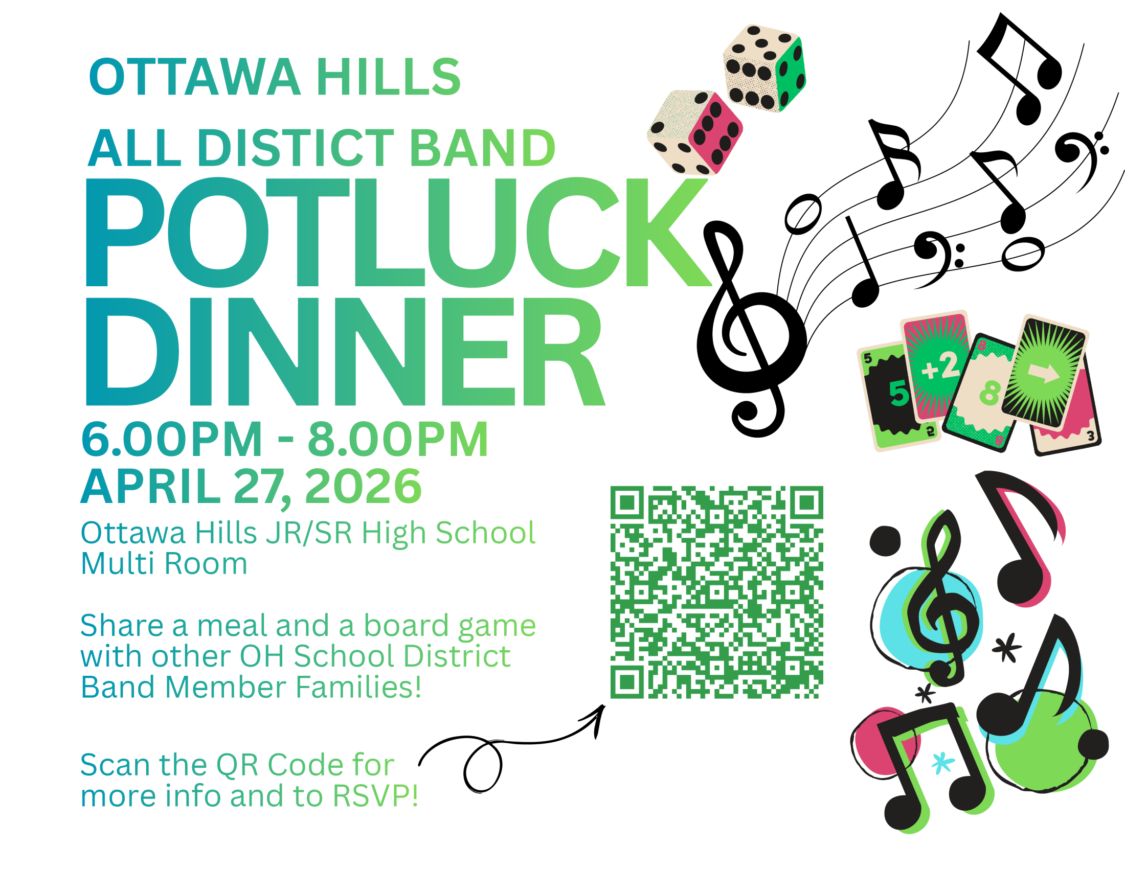 Join us on Monday, April 27th for an All District Band Family Dinner. All band students (5th-12th) and their families are invited to attend. Dinner will be potluck style - scan the QR code or use the button below for suggestions on what to bring - and we will provide board games, cards, and cake. A casual event for band students and their families to come together and celebrate our musicians.